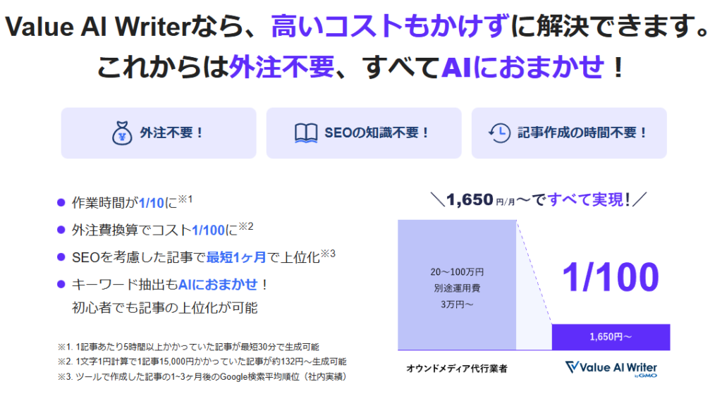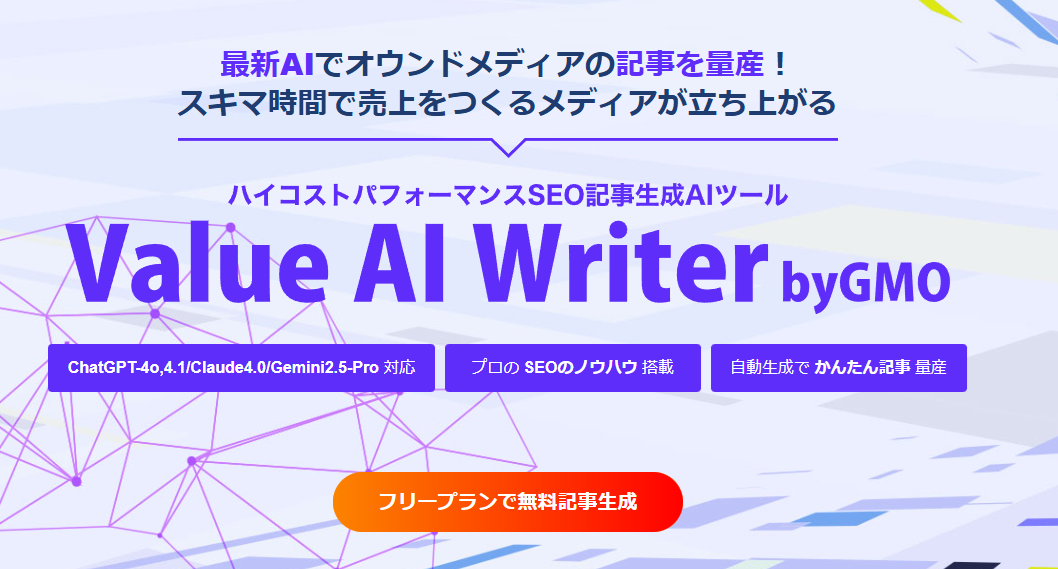 私が SEO 対策済の記事を効率よく作るために使っているのが Value AI Writer です。 合う・合わないは人によるので、必要な方だけ公式情報をご確認ください