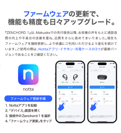 Zenchord 1 はNottaと連携して、会議や講義の内容を文字起こし・要約・翻訳できるAI議事録イヤホンとして紹介されています。録音を起点に“共有できる形”まで持っていけるのが狙いどころです。